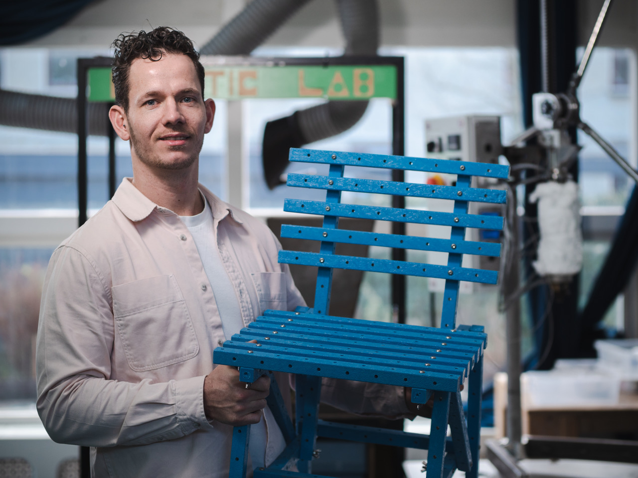 Bij Plastic Lab 070 kun je workshops volgen om van oud plastic een nieuw product te maken. Van plastic tasjes wordt een portemonnee gemaakt.  En van versnipperd plastic een stoel of krukje.